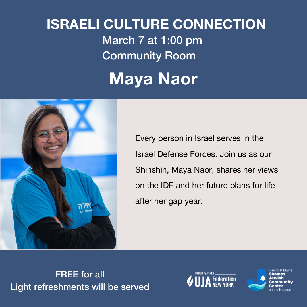 Every person in Israel serves in the Israel Defense Forces. Join us for casual conversation as our Shinshin, Maya Naor, shares her views on the IDF and her future plans for life after her gap year.